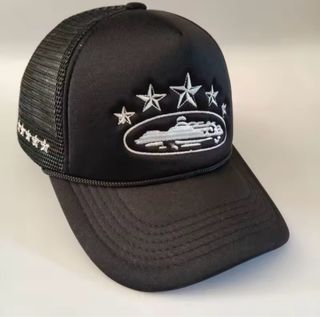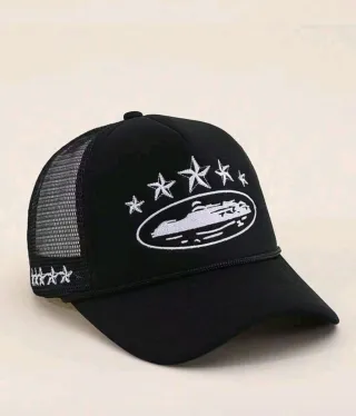 Gorra de la marca Corteiz en color negro. Presenta un diseño con estrellas bordadas y un emblema de barco. - Malla transpirable en la parte trasera. - Detalle de estrellas bordadas en la visera. - Parche delantero con diseño de barco y estrellas.