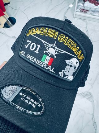 Gorra negra con diseño Joaquin Guzman 701 El General. - Parche frontal con helicóptero y bandera de México. - Detalle de retrato en el parche. - Malla trasera para ventilación.