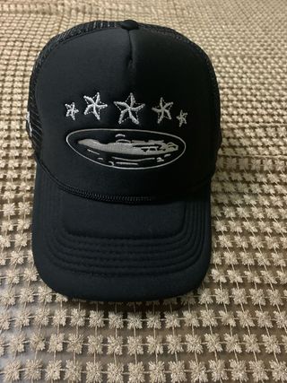 Gorra de la marca Corteiz en color negro con un diseño distintivo. - Detalle de estrellas bordadas en la parte frontal. - Emblema ovalado con diseño gráfico. - Malla transpirable en la parte trasera.