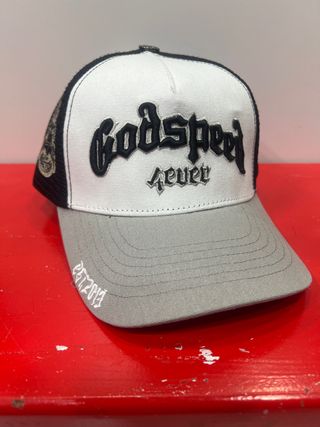 Gorra estilo trucker con el logo Godspeed 4 Ever bordado. - Paneles frontales blancos y traseros de malla negra. - Visera gris con costuras. - Detalle bordado EST. 2013 en la visera.