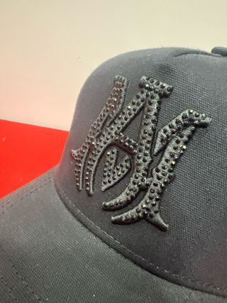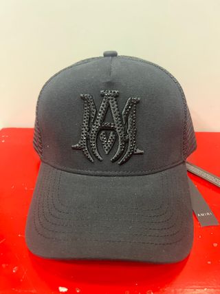 Gorra trucker de la marca Amiri en color negro. Presenta un diseño llamativo con detalles brillantes. - Logo de Amiri con pedrería. - Paneles traseros de malla. - Visera curva.