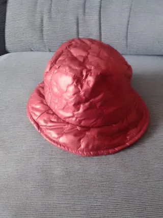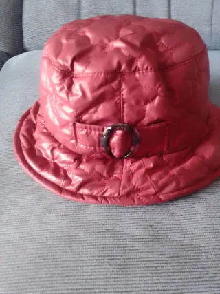 Gorro de lluvia de mujer con un diseño moderno. - Tejido impermeable de diseño acolchado. - Detalle de hebilla circular en un lateral. - Color rojo cereza. - Forro interior textil negro - Sin usar. - Tamaño medio. Medidas: perímetro 58 cm, diámetro: 20 cm aprox