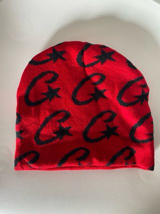 Gorro de tejido con un diseño llamativo. - Color base rojo. - Estampado de estrellas negras. - Diseño de la marca 'C’ en negro. -Talla única -Viene con el embalaje original -Imitación de Corteiz
