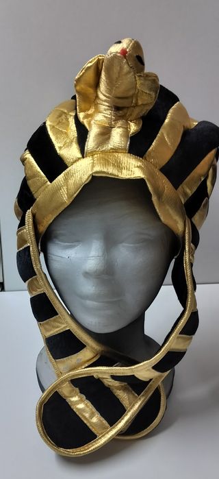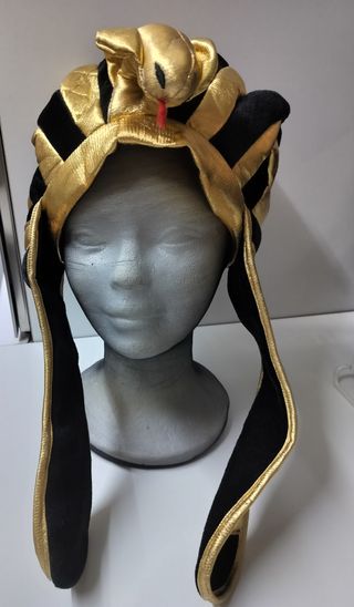 Gorro con diseño egipcio que es un accesorio llamativo y definiría un disfraz de temática egipcia muy original. Es de tela, alterna bandas de terciopelo negro con otras de un material tipo "foan" doradas. Por dentro va forrado y no se ven las costuras. Detalle de cobra, símbolo de la diosa Wadjet.