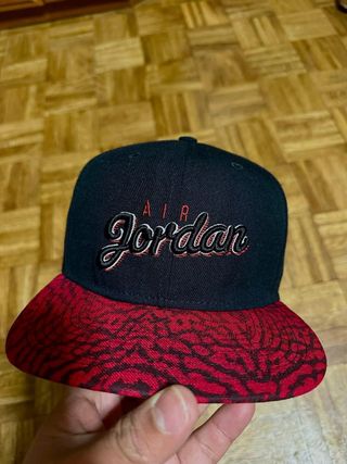 Gorra de la marca Jordan con un diseño llamativo. - Parte frontal negra con bordado. - Visera con estampado de elefante en rojo y negro.