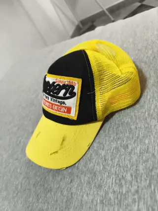 Gorra estilo trucker con un diseño vintage y llamativo. - Parche frontal con el texto Western, New York Vintage, Adventures Begin. - Malla transpirable en la parte trasera. - Visera con un toque desgastado.