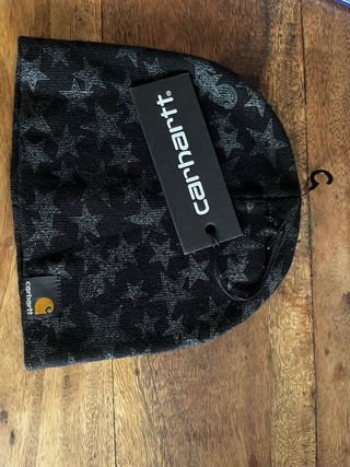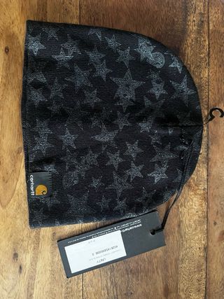 Gorro de la marca Carhartt con un diseño de estrellas. Talla S - Color principal negro con estampado en gris. - Etiqueta de la marca en la parte frontal.