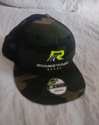 Gorra de la marca New Era con diseño de camuflaje y cierre snapback. Comprada en Amsterdam - Logo bordado de Resource Pavement Group. - Malla trasera para ventilación. - Talla única ajustable.