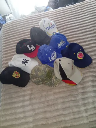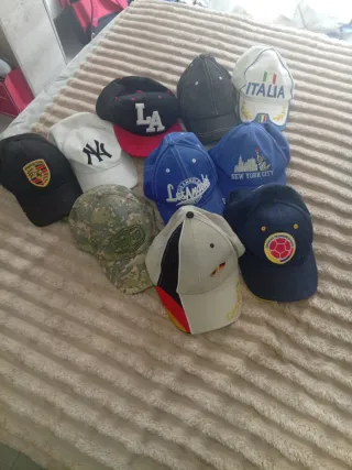Lote de gorras de diferentes estilos y diseños. - Gorra negra con logo LA. - Gorra blanca con logo NY. - Gorra azul con Los Angeles. - Gorra azul con New York City. - Gorra blanca con Italia. - Gorra negra con logo de Porsche. - Gorra de camuflaje. - Gorra con diseño de bandera de Alemania. - Gorra azul con escudo de fútbol.