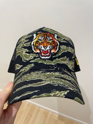 Gorra de estilo trucker con un llamativo diseño de camuflaje y un parche de tigre bordado en la parte frontal. - Diseño de camuflaje verde y negro. - Parche de tigre con detalles bordados. - Malla en la parte trasera para ventilación.