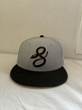 Gorra de la marca New Era, comprada en Estados Unidos. Presenta un diseño con un bordado de serpiente. - Color principal gris en la copa. - Visera de color negro. - Bordado frontal de serpiente en negro.