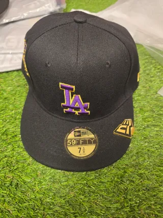 Gorra de la marca New Era con el logo de LA. - Color principal negro. - Detalles en morado. - Talla 7 1/4.