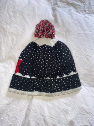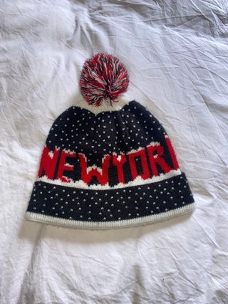 Gorro de invierno con diseño de New York y pompón. - Diseño tejido con el texto New York. - Pompón multicolor en la parte superior. - Patrón de pequeños puntos blancos sobre fondo negro.