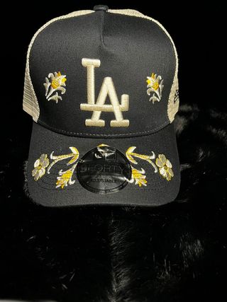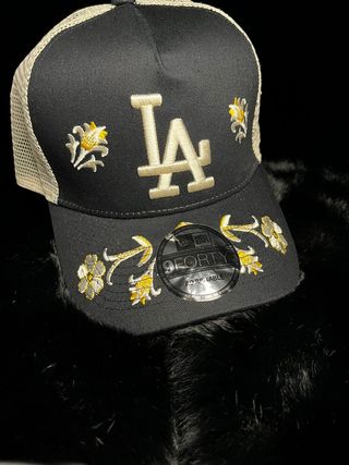 Gorra de la marca New Era con un diseño floral bordado. - Parte frontal negra con logo LA en beige. - Malla trasera en color beige. - Detalles bordados de flores en tonos amarillo y gris.