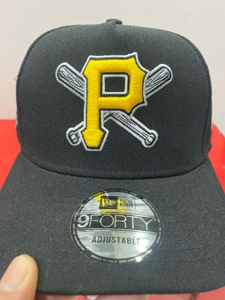 Gorra ajustable de los Pittsburgh Pirates. - Diseño con el logo 'P' y bates cruzados. - Etiqueta New Era 9FORTY. - Color negro con detalles dorados.