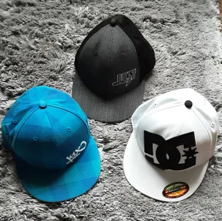 Lote de tres gorras de estilo retro con visera plana: - Gorra NEW ERA 59 FIFTY, azul con diseño a cuadros, talla 7 1/4 (57,7 cm). - Gorra LOST cuadritos gris y negra con logo LOST, talla 7 1/4 (57,7 cm). - Gorra DC Shoes 210 fitted by flexfit blanca con logo negro, talla 6 7/8 - 7 1/4. Han estado expuestas y sin usar en una estantería cerrada. Se venden también por separado a 13€