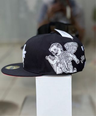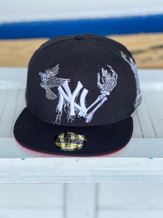 Gorra de béisbol New Era con el icónico logo de los New York Yankees. Presenta un diseño único y llamativo. - Color principal negro con detalles multicolores. - Diseño de calavera y águila. - Visera plana. pregunta por tallas disponibles