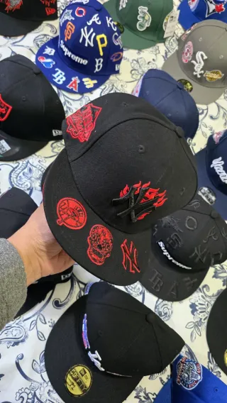 Gorra estilo New Era con el icónico logo NY. - Diseño en color negro con detalles en rojo. - Visera plana. - Logo NY bordado en la parte frontal.