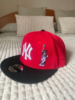 Gorra New Era de los New York Yankees, modelo 9FIFTY. - Diseño ajustable. - Combinación de colores rojo y negro. - Parche de la Serie Mundial. - Detalle de la Estatua de la Libertad.