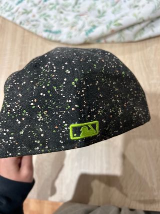 Gorra New Era con un diseño llamativo y moderno. - Color base negro con salpicaduras verdes y blancas. - Logo bordado en color verde brillante. - Modelo 9FORTY ajustable.
