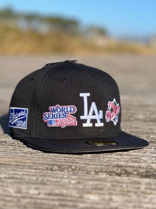 Gorra New Era 59FIFTY de color negro con varios parches. - Parche LA en blanco en la parte frontal. - Parche World Series 1988 en el lateral. - Parche World Series 1961 en el lateral. - Parche World Series en la parte trasera.