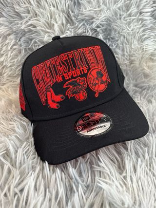 Gorra de béisbol con diseño llamativo. - Color principal negro con detalles en rojo. - Bordado frontal CREATESTURI MIN SPORTS. - Parche 9FORTY ADJUSTABLE en el lateral.