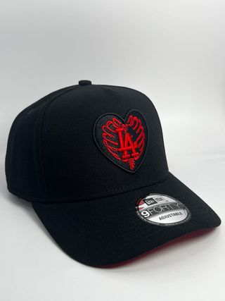 Gorra New Era 9FORTY A-Frame Los Ángeles, Dodgers LA - Parche frontal con diseño de corazón y costillas. - Cierre ajustable en la parte trasera. - Visera plana característica del modelo 9FORTY.