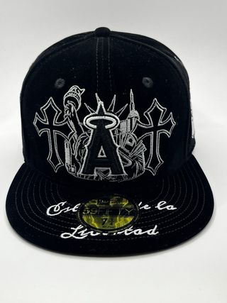 Gorra New Era 59FIFTY con un diseño llamativo. 59FIFTY LA ANGELS -Talla 7 1/4 - Color principal negro con detalles en rojo. - Bordado frontal con diseño de esqueleto y rosas. - Inscripción lateral SEVEN SEATS en rojo. - Visera plana con cruces bordadas.
