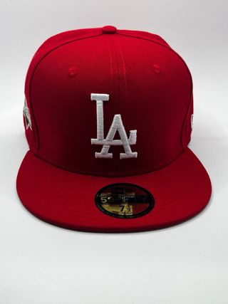 Gorra New Era 59FIFTY con el logo de los LA Dodgers. -Talla 7 3/8 - Diseño con el logo LA en rojo y dorado. - Parche de la World Series en el lateral. - Visera plana característica del modelo 59FIFTY.