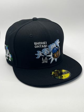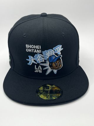 Gorra New Era 59FIFTY con diseño de Shohei Ohtani. - Color principal negro. - Detalles bordados en blanco y azul. - Talla 7 3/8 (aproximadamente 58.7 cm). - Parche oficial de la MLB en la parte trasera.
