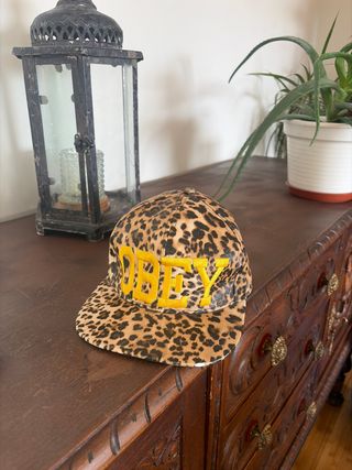 Gorra de estilo snapback con un diseño llamativo. - Visera con estampado de leopardo y efecto piel. - Parche frontal con el logo OBEY bordado en relieve. - Detalles bordados en la parte superior de la gorra.