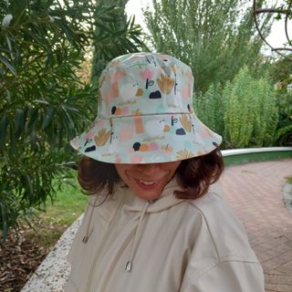 Sombrero de lluvia hecho en tela impermeable estampada de hojas y ramas sobre fondo rosa muy claro. Con forro interior de forro polar. Ideal para ponértelo en tus paseos por la ciudad y el campo. Te protegerá del frío y la lluvia, y llevarás la cabeza bien calentita de la forma más chic. Súper combinable! Talla única. Está nuevo, con etiquetas y nunca se ha usado. Proviene de una tienda de productos hechos a mano en España