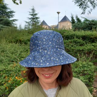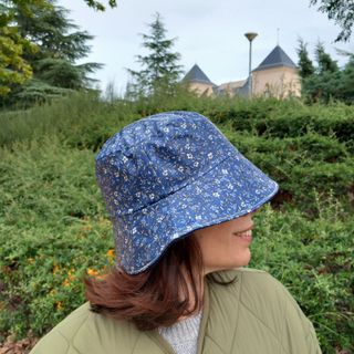 Sombrero de lluvia hecho en tela impermeable estampada de floritas en tonos coral y blanco sobre fondo azul. Con forro interior de forro polar. Ideal para ponértelo en tus paseos por la ciudad y el campo. Te protegerá del frío y la lluvia, y llevarás la cabeza bien calentita de la forma más chic. Súper combinable! Talla única. Está nuevo, con etiquetas y nunca se ha usado. Proviene de una tienda de productos hechos a mano en España.