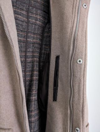 Chaquetón de largura 80 cm. Color beige de el corte inglés, con bolsillos en cada lateral y uno en el interior. Está nueva sin etiqueta.Talla 52. Tiene gorro. Muy elegante y calentita