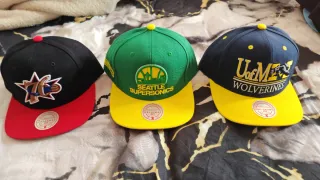 Lote de tres gorras planas de la marca Mitchell & Ness. - Gorra negra con logo de los Philadelphia 76ers. - Gorra verde y amarilla con logo de los Seattle Supersonics. - Gorra azul marino y amarilla con logo de los Michigan Wolverines.