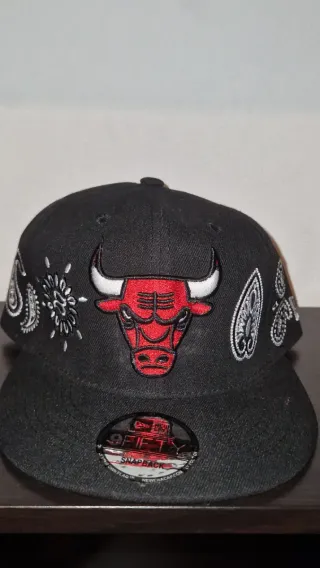 Gorra plana de los Chicago Bulls, modelo 9FIFTY de New Era. STOCK: 1 UNIDAD - Diseño con el logo del equipo. - Detalles de paisley bordados en los laterales. - Cierre ajustable tipo snapback. Para mas info de los modelos disponibles escribemos por mensaje o síguenos en nuestras redes: - Tiktok: @urban_caps_store -IG: @urban_caps_store_1996 - Wsp: 672399484