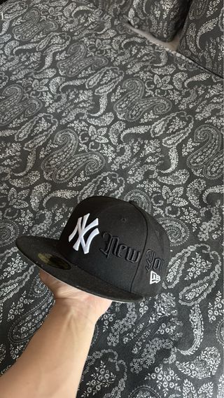 Gorra de New Era con el logo de los New York Yankees. - Color principal negro. - Logo bordado en color dorado. - Visera plana. - Talla 7 5/8 (60.6 cm). Precio negociable
