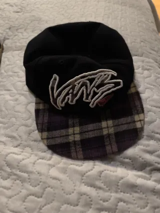 Gorra de la marca Vans con un diseño llamativo. - Parte frontal negra. - Visera con estampado de cuadros escoceses en morado y beige. - Logo de Vans bordado en blanco y rojo.