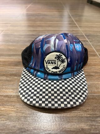 Gorra estilo trucker de Vans con un diseño llamativo. - Parte frontal con estampado multicolor. - Malla trasera negra. - Parche circular con logo Vans Off The Wall y palmeras.