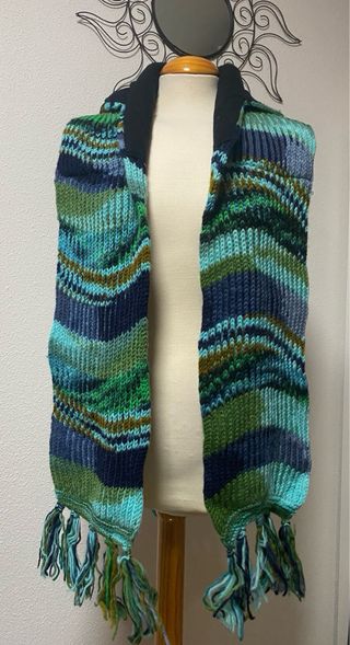 Bufanda con gorro, tejida a mano en Nepal. Es una pieza única con un diseño llamativo. - Hecha 100% de lana. - Colores variados en tonos azules y verdes. - Incluye flecos en los extremos.