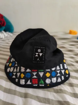Gorro de estilo bucket hat de Jordan, con un diseño llamativo. Talla M/L - Estampado geométrico multicolor en la visera. - Detalle de etiqueta con logo y texto QUAI 54 15TH EDITION.