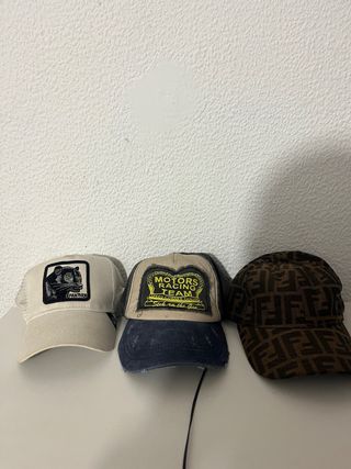 Conjunto de tres gorras con diseños variados. - Gorra con parche de pantera. - Gorra con diseño Motors Racing Team. - Gorra con estampado de monograma.