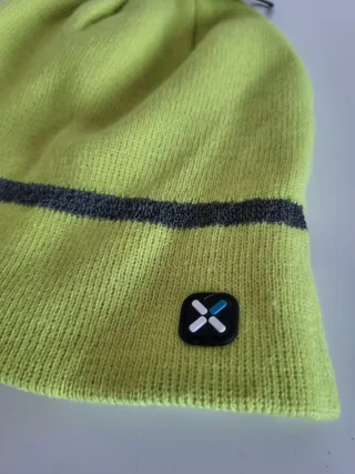 Gorro de punto con diseño moderno. - Raya gris en la parte inferior. - Detalle de logo en la parte frontal. - Color amarillo/verde pistacho