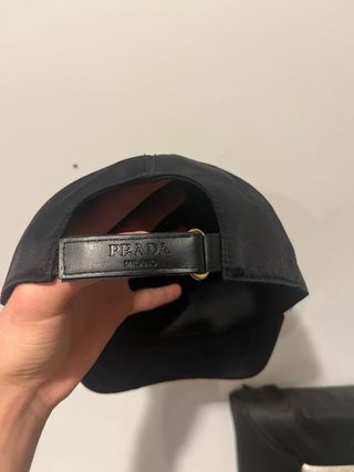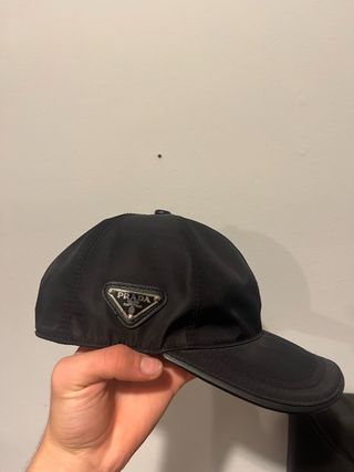 Gorra de la marca Prada en color negro. Presenta el icónico logo triangular de la marca. - Logo triangular metálico. - Diseño clásico de gorra.