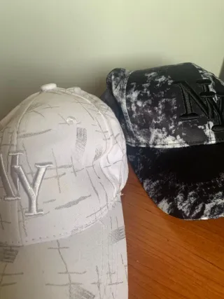 Oferta de Dos gorras con el logo NY originales sin usar - Diseño actual con salpicaduras en negro y blanco. - Diseño a cuadros en gris y blanco. Se escuchan ofertas razonables