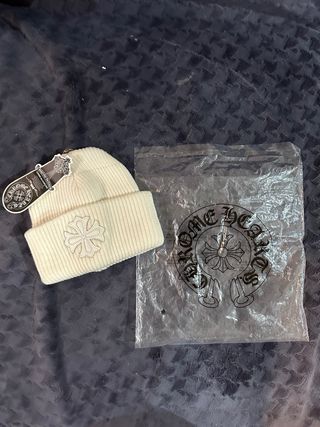 Gorro de punto de la marca Chrome Hearts en color blanco. Incluye su bolsa original. - Diseño de punto acanalado. - Detalle de logo de la marca bordado en la parte frontal. - Incluye etiqueta.