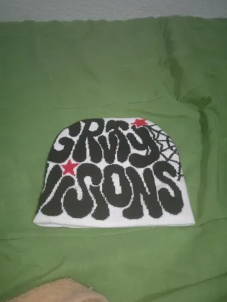 Gorro de punto con diseño llamativo. - Diseño de letras GRY SONS en negro. - Detalles de estrellas rojas. - Tejido de punto blanco y negro.