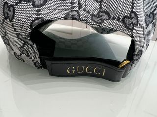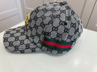 Gorra con el icónico estampado GG de Gucci y detalles en dorado. - Diseño con monograma GG. - Banda lateral con rayas verdes y rojas. - Detalle metálico dorado en el lateral.