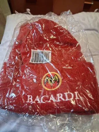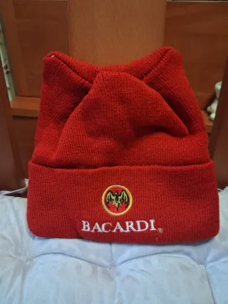 Gorro de lana tejido con el logo de Bacardi bordado. - Diseño con orejas. - Color rojo vibrante. - Talla única.