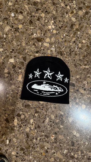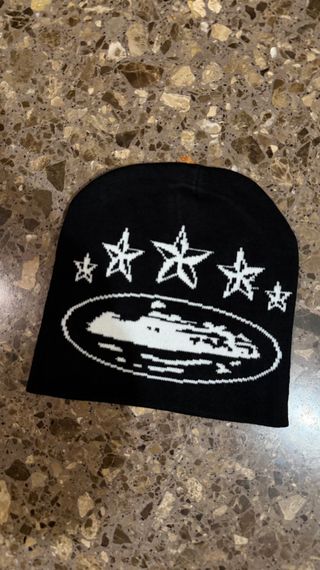 Gorro de la marca Corteiz con un diseño llamativo. - Diseño de estrellas y un gráfico central. - Tejido de punto cómodo.